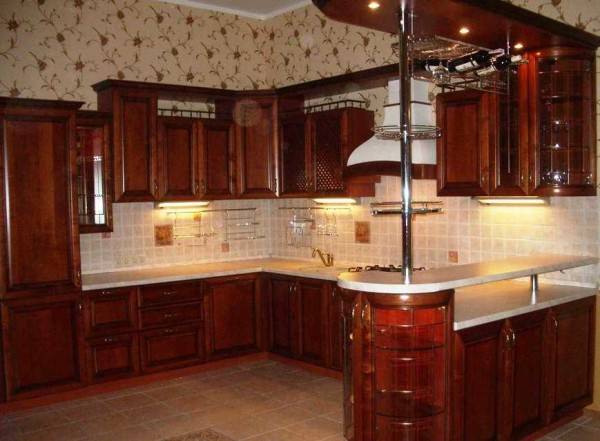 Гарнитур и стойка кухни в классическом стиле должны выглядеть консервативно, иметь плавные линии. Их изготавливают в светлых теплых тонах из натуральных материалов или адаптированных к натуральной древесине. Используют искусственный камень, массив или ЛДСП – ламинированную древесно-стружечную плиту. Бытовая техника частично или полностью скрывается за фасадами шкафов. Из декора приветствуется резьба по дереву, инкрустация мозаики, филенка, молдинги.