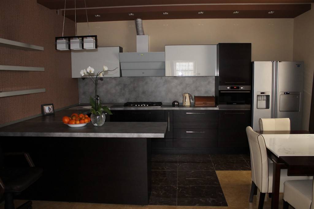 Основной задачей тут будет подобрать конструкцию, которая выгодно сыграет на контрасте кухонного гарнитура.