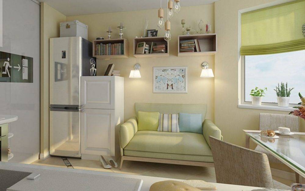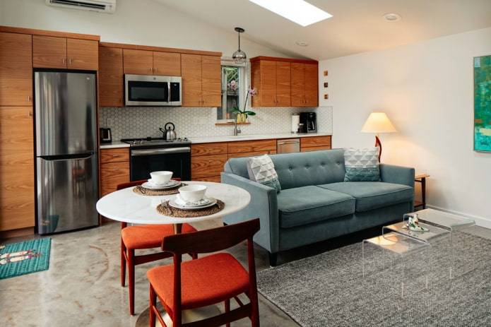 Отделите зону кухни с помощью перегородки, стеллажа, барной стойки. Небольшой диван или кресла с кофейным столиком прекрасно впишутся в зону для отдыха и чтения.