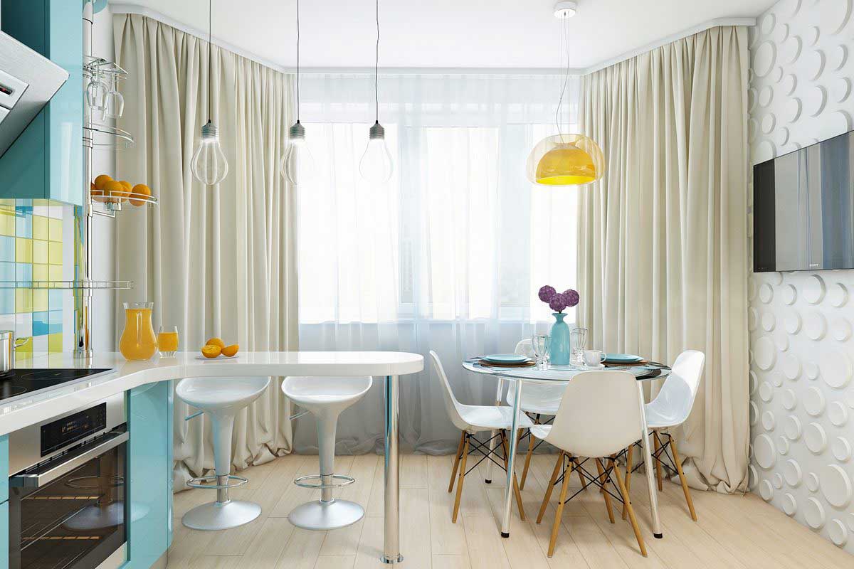 - Выбирайте легкие летящие занавески, ведь сама конструкция эркера предусматривает некую невесомость. Тонкие полупрозрачные ткани, нежные оттенки и игривые цвета — то, что нужно, они буквально преобразят дизайн кухни с эркером.