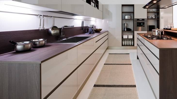 Существуют разные компоновки кухонь, они бывают угловые, прямые, п-образные, по обеим сторонам стен, а также прямые кухни, совмещенные с обособленной зоной по центру, они и называются островными.