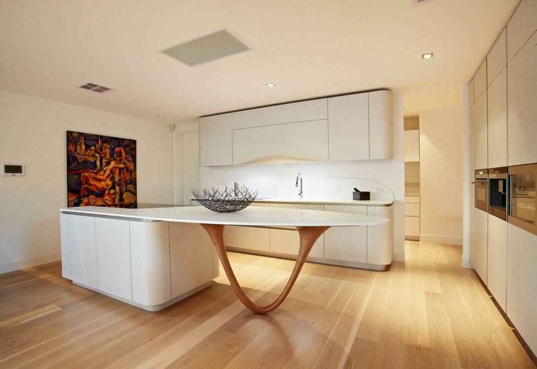 В нем будет очень уместно расположить многоуровневую п-образную кухню с полуостровом или же отдельную кухню–остров стоящий по центру комнаты, как настоящий арт объект.