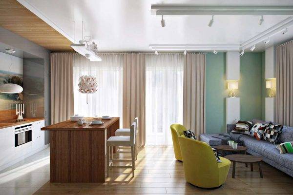 В небольшой комнате грамотная планировка позволит правильно использовать пространство кухни-острова, сделав максимально функциональным каждый ее сантиметр, что отчетливо видно на фото.