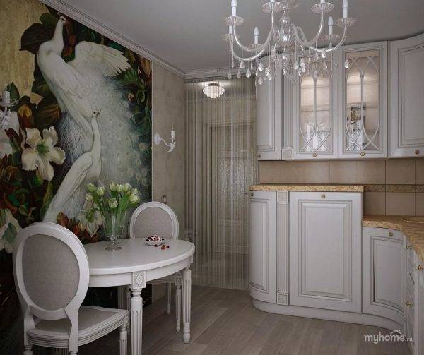 Для классической стилистики характерна светлая пастельная гамма и изящная меблировка из натурального дерева. В оформлении окон присутствуют дорогие драпированные ткани, на потолке располагается роскошная люстра из хрусталя. Квартиру в хрущевке в стиле классика уместно дополнить фальш-камином.