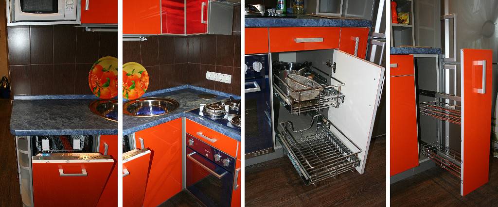 Проследите, чтобы дверцы открывались горизонтально, не занимая площади при открытии. Помните, кухня в хрущевке диктует правило для шкафов – лучше уже и выше, чем шире и ниже.