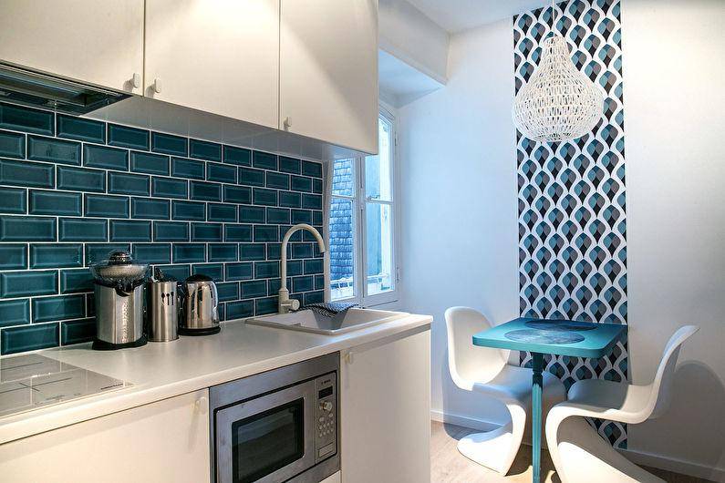 Для отделки стен применяются влагоустойчивые краски, моющиеся обои, панели из пластика. Рабочую стенку («фартук») традиционно выкладывают керамической плиткой, однако, можно поэкспериментировать с искусственным камнем или с закалённым стеклом.