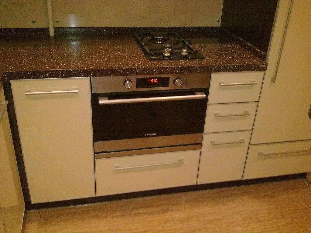 При размещении стиральной машины выбор также не велик. Скорее всего, она займет место одного из напольных шкафов. Чтобы избежать проблем с прокладкой коммуникаций, а затем с расположением дополнительных шлангов и труб, ставить ее целесообразно возле мойки. Если на кухне нет духовки, а установлена компактная варочная поверхность, то стиральную машину можно установить под нее.