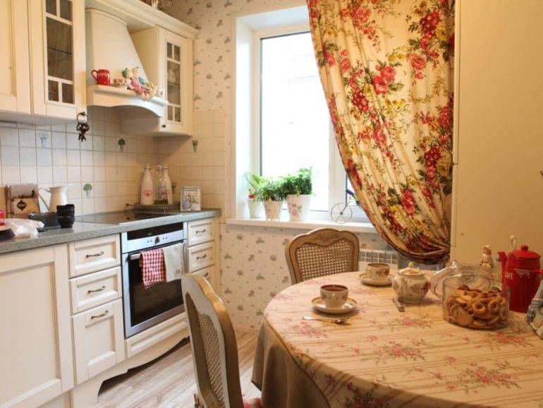 В маленькой кухне нет места тяжёлым шторам с большим количеством сборок. Желательно остановиться на лёгких занавесках из синтетических тканей либо использовать жалюзи или рулонные шторы.