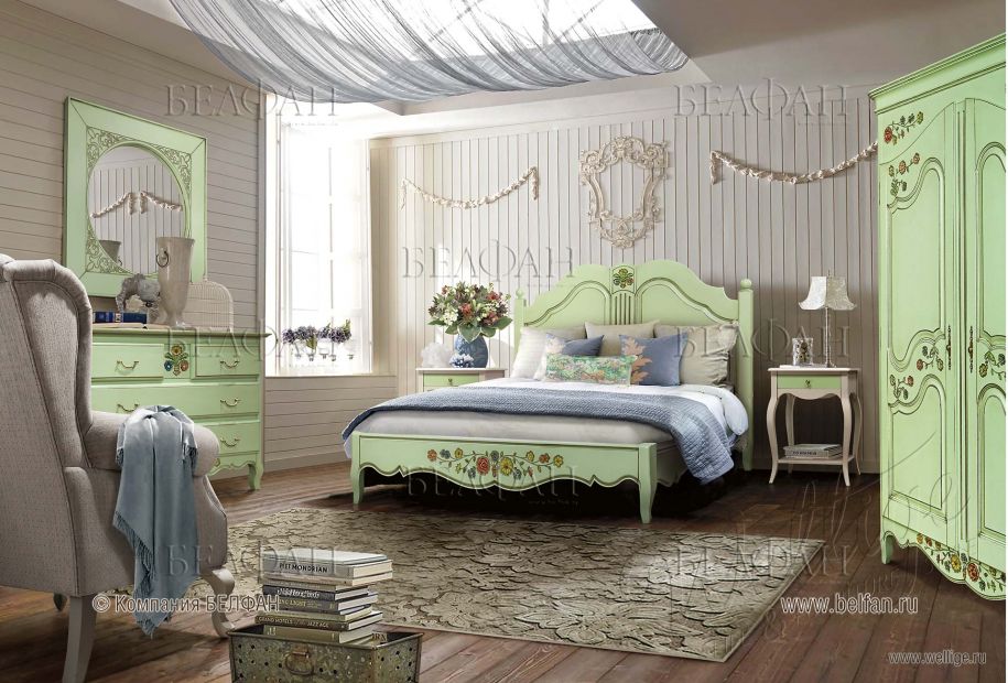 Деревенские варианты дизайна предполагают, что в спальне будут использованы натуральные материалы − дерево и тканевый текстиль. В легком и светлом провансе присутствуют состаренные модели мебели, прозрачный текстиль, декоративные подушки разных форм. Стены и мебель пастельных тонов: светло-голубого, бледно-розового, желтоватого, цвета лаванды. Еще прованс характеризуется наличием декора в виде цветочного принта.