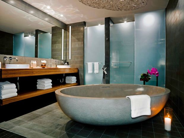Невысокий подиум с одной или двумя ступенями позволит акцентировать внимание на главном предмете в ванной комнате и улучшить эргономику пространства. А чтобы ванна смотрелась более эффектно, эту зону можно подчеркнуть парными колоннами и художественным панно. А бра с текстильными абажурами, изящная штора и серебряная ваза для цветов добавят в интерьер домашнего спа еще больше уюта.
