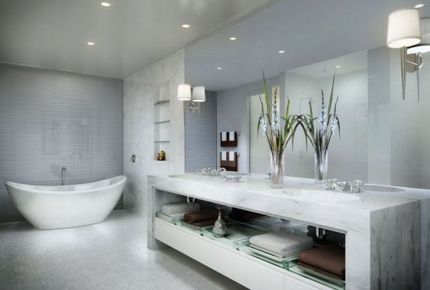 Современное освещение ванной комнаты прежде всего, зонирует и визуально расширяет пространство. Мало кто может похвастаться ванной комнатой большой площади или панорамным окном. Именно поэтому ансамбль источников света, а также глянцевых поверхностей – зеркал, стеклянных и хромированных деталей – позволяют увеличить площадь ванной.