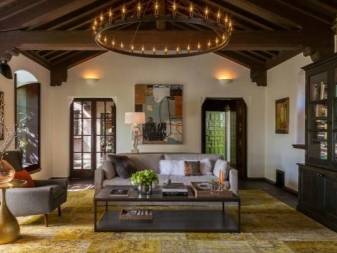 Люстры, изготовленные «под старину» с рельефными узорами, восхитительно смотрятся в гостиной – для такой модели требуется дизайн помещения «под стать». На фотографиях видно, что нередко вкупе с такой люстрой в гостиной есть много зеркал и картин. Лучше всего старинную атмосферу передает деревянная люстра – такой светильник вписывается почти в любой интерьер.