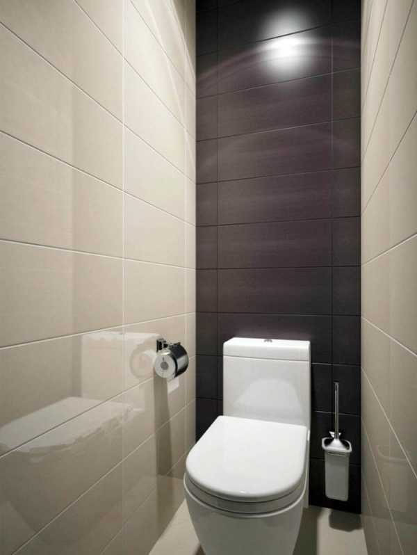 Горизонтальная раскладка прямоугольной плитки сделает туалет зрительно шире, а вертикальная — выше. Если использовать контрастную затирку, то этот визуальный эффект проявится еще сильнее. Красиво смотрится диагональная раскладка квадратной плитки, увеличивающая пространство. Контрастные горизонтальные или вертикальные полоски станут декоративной «фишкой» в монохромной отделке.