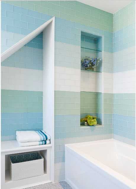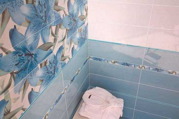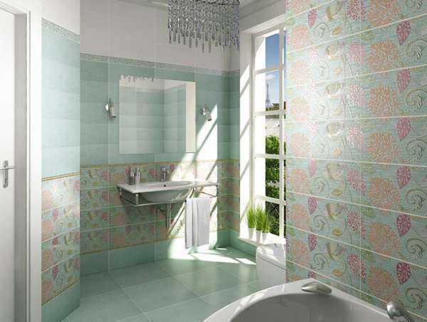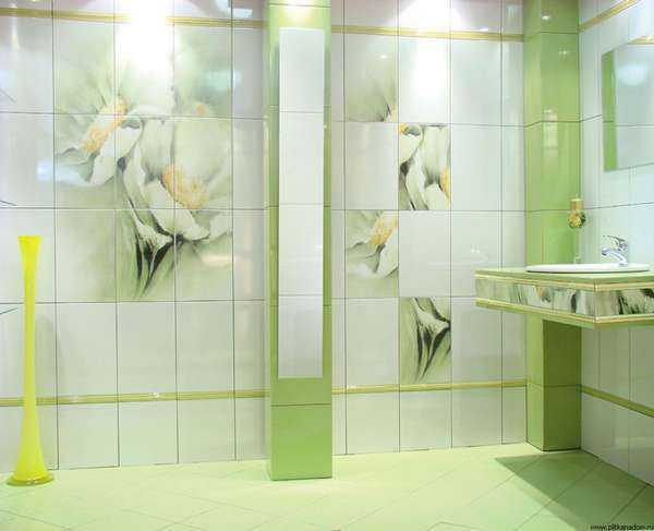 Самый лучший вариант – разделение стены на две части по горизонтали. Для разделения лучше всего использовать бордюр с небольшим, но интересным орнаментом. Вверху стена оформляется в более светлом цвете, как и потолок, а вот нижняя часть стены и пол – на несколько тонов темнее. Таким образом, можно визуально поднять потолки, сделать комнату более просторной. Единственный нюанс – нельзя использовать плитку, тон которой может показаться слишком мрачным или угрюмым.