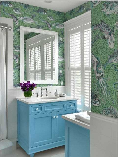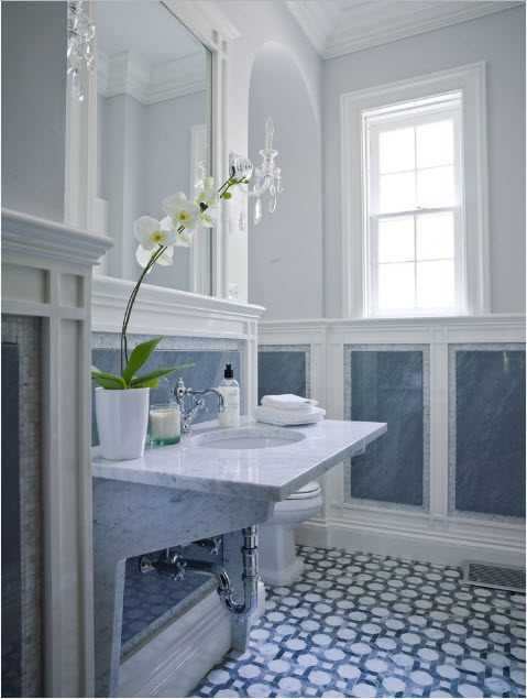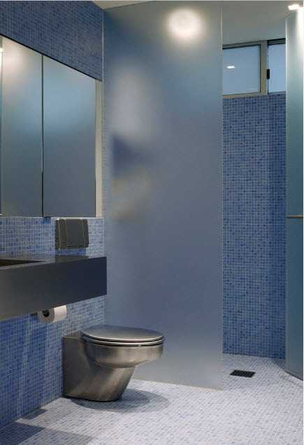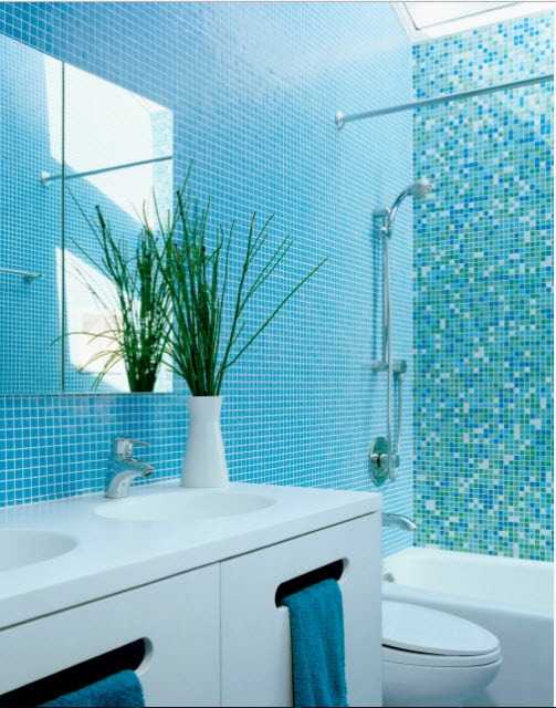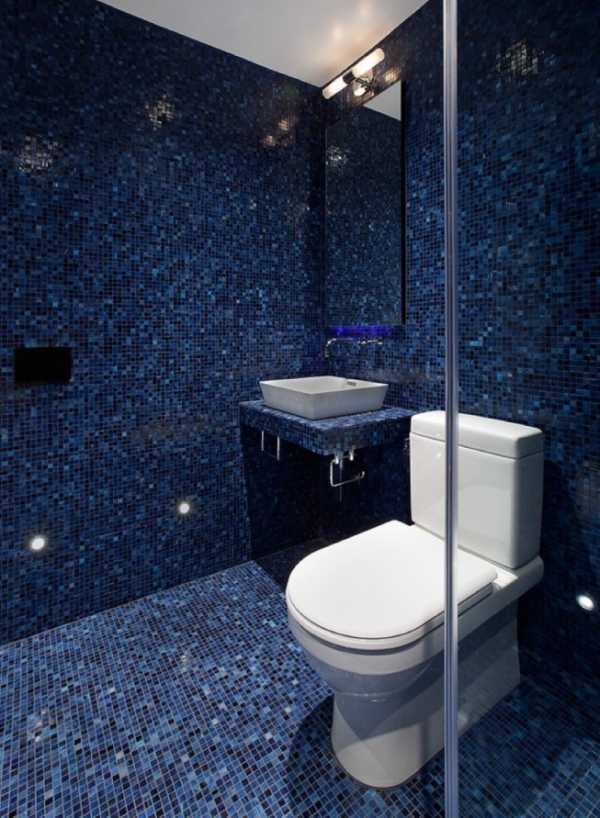 Синий цвет напоминает воду, поэтому он всегда находил место в отделке ванных и туалетов. Сейчас в моде сложные синие тона: цвет морской воды, бирюзовый, ультрамариновый.