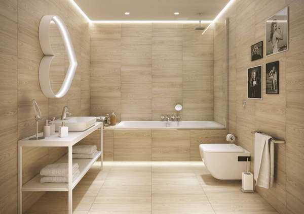 Плитка бежевого цвета красиво смотрится как с глянцевой, так и с матовой поверхностью. Комбинация бежевой плитки разных оттенков и текстур добавит объем дизайну санузла, сохранив общую цветовую гамму.