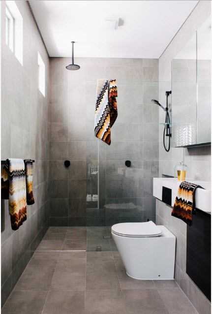 Схожий вариант облицовки всех поверхностей одним видом плитки, но уже в более темных, природных тонах. В таком помещение нужно будет уделить особое внимание освещению, иначе небольшое пространство с достаточно темной палитрой будет психологически «давить» на домочадцев.