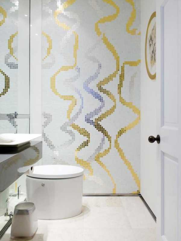 Еще одна акцентная стена из мозаики, но уже в более спокойном, хоть и разноцветном варианте. Мозаика очень выигрышно смотрится вместе с зеркальными поверхностями и глянцем однотонной плитки на соседней стене.