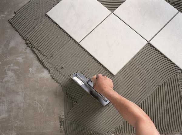 Укладка плитки начинается с «переднего угла», вид на который открывается с порога туалета. В емкость для раствора наливается вода, туда же засыпается сухая смесь. Пропорции всех компонентов, указанные в инструкции на упаковке продукта, подлежат свободной коррекции для достижения необходимой вязкости.