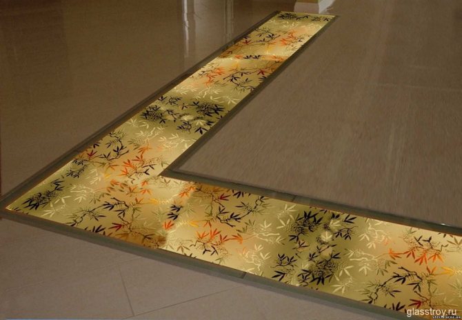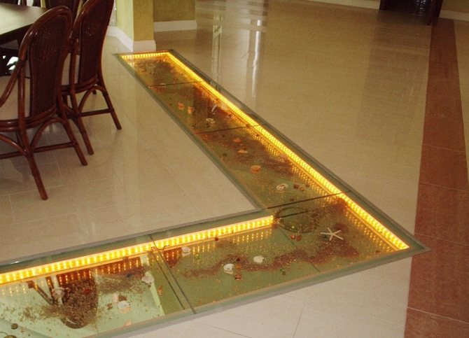 - Ленточные полы. Устанавливаются дорожками вдоль стен, что визуально увеличивает пространство комнаты. Она становится более светлой и просторной. Под стеклом можно создавать различные рисунки, картинки, которые подчеркивают оригинальность покрытия.