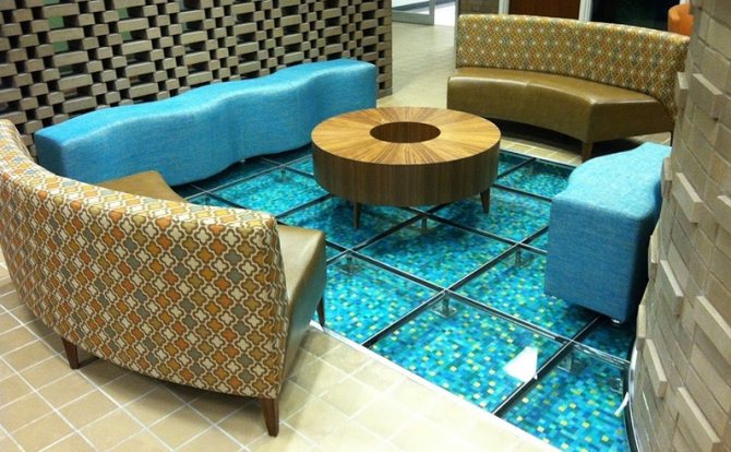 Если желание сделать стеклянный пол не сопряжено с финансовой свободой или желанием слишком вычурно украшать домашнее пространство, всегда есть возможность выбрать предельно простой и удобный вариант. К примеру, можно создать мозаичный пол, декорируя яркими стеклянными деталями выбранный участок.