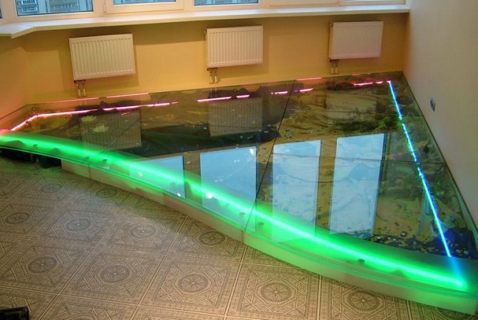 Пол можно немного приукрасить, установив специальное освещение. Для этого применяют только светодиодные, неоновые и люминесцентные ламы. Они не нагревают стекло и не придают дискомфорт. Обычные и галогенные лампы способны нагреть материал и испортить его. В летний период времени будет поверхность будет очень жаркой. Все это нужно учитывать перед покупкой материалов. Для стеклянного пола на всю комнату устанавливают прожекторы. Они очень яркие и потребляют малое количество энергии. Стеклянный пол имеет хорошую особенность. Его можно установить с подсветкой, как показано на различных фото и видео.
