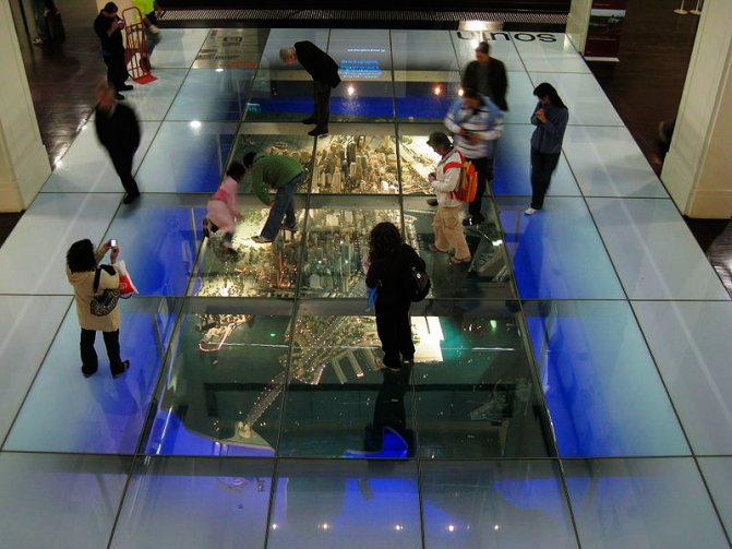 - Стеклянный напольный подиум. В развлекательных центрах и жилых домах уже давно принято обустраивать пол из стекла в виде возвышения. Такая конструкция располагается выше обычного пола примерно на 150 миллиметров.