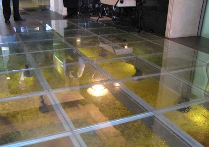 - Аквариум в полу. Однако стоимость стеклянного пола с живым аквариумом и плавающими рыбками зашкаливает! Популярным решением считается сочетание стеклянного пола и деревянного напольного покрытия.
