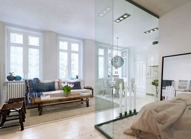 Зачастую такой тип перегородок используется в небольших квартирах или квартирах-студиях. С помощью стекла можно не только разделить кухню и другие комнаты, но и разделить помещение на «дневную» и «ночную» зоны. В некоторых современных квартирах такие перегородки используют даже для отделения санузла от других комнат, однако не всем такой вариант придется по душе.