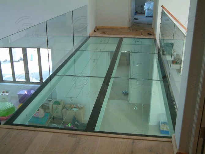 Конструкция со стеклянным полом устанавливается на клееные балки межэтажного перекрытия.