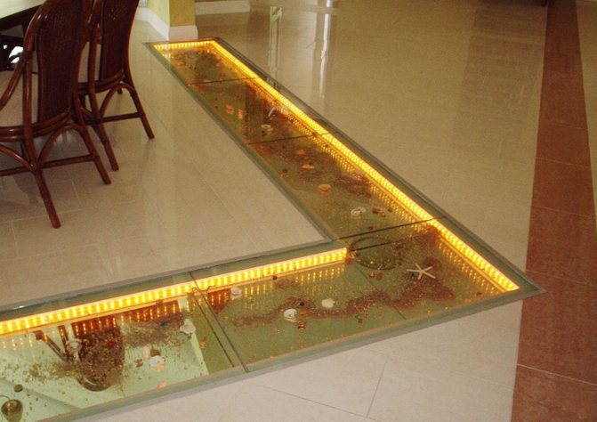 - Стеклянные ниши. Подобная конструкция представляет собой углубление определенной формы, которое делают на поверхности пола, заполняют декоративными элементами и затем покрывают стеклянными плитами. Стеклянные напольные окна придадут оригинальность любой комнате, так как позволяют создать внутри конструкции флористическую композицию из высушенных растений, лепестков роз и блесток, настоящую выставку сувениров, монет или минералов, воссоздать сухой аквариум или кусочек пляжа из морской гальки или песка.