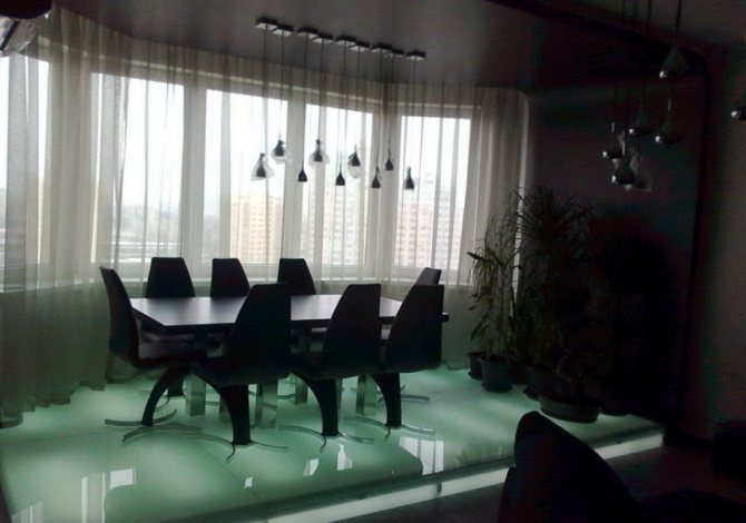 - Возможно покрытие стеклом большого пространства. Такой пол непременно должен иметь установленную подсветку. Благодаря свойствам светопрозрачности материала, получается неповторимое, уникальное оформление помещения.