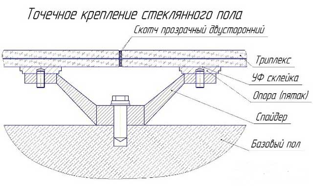 Другим важным элементом стеклянного пола нужно назвать прозрачное декоративное покрытие. Эта часть должна быть изготовлена из прочного триплекса, чтобы выдерживать большие нагрузки. Иногда в качестве декоративного покрытия выступает ламинированное закаленное стекло, но оно требует особенного подхода при монтаже.