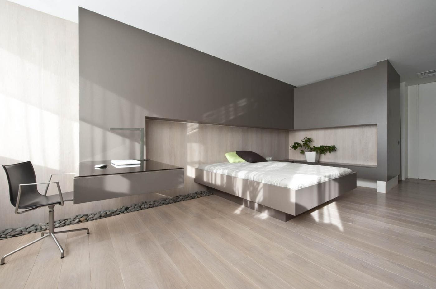 Ламинат под дерево в спальной комнате, оформленной в стиле японского минимализма