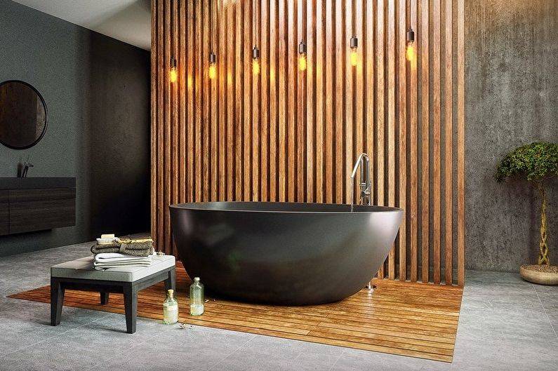 Интересный способ придать ванной комнате характер — покрыть чашу для купания различными отделочными материалами: деревом, плиткой, имитирующей натуральное сырье, такое как камень, шпон или бетон. Как правило, выбор падает на керамическую плитку, поверхность которой легко моется, устойчива к влаге и частому контакту с водой, а также не создает проблем при эксплуатации