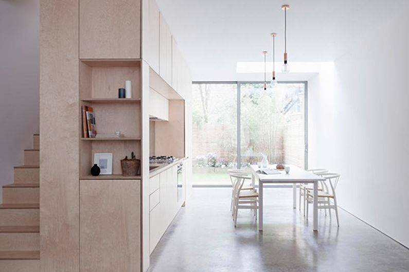 С помощью правильной планировки можно разделить кухню на рабочую и обеденную зону. Стоит использовать фактурные поверхности стола и стульев, натуральные цвета отделки, применение хромированной стали на кухонном гарнитуре. Не стоит забывать, что яркая посуда и пестрые панно способны гармонично смотреться на многих кухнях, но не в стиле минимализм. Тут нужно соблюдать особую цветовую гамму даже в мелочах.