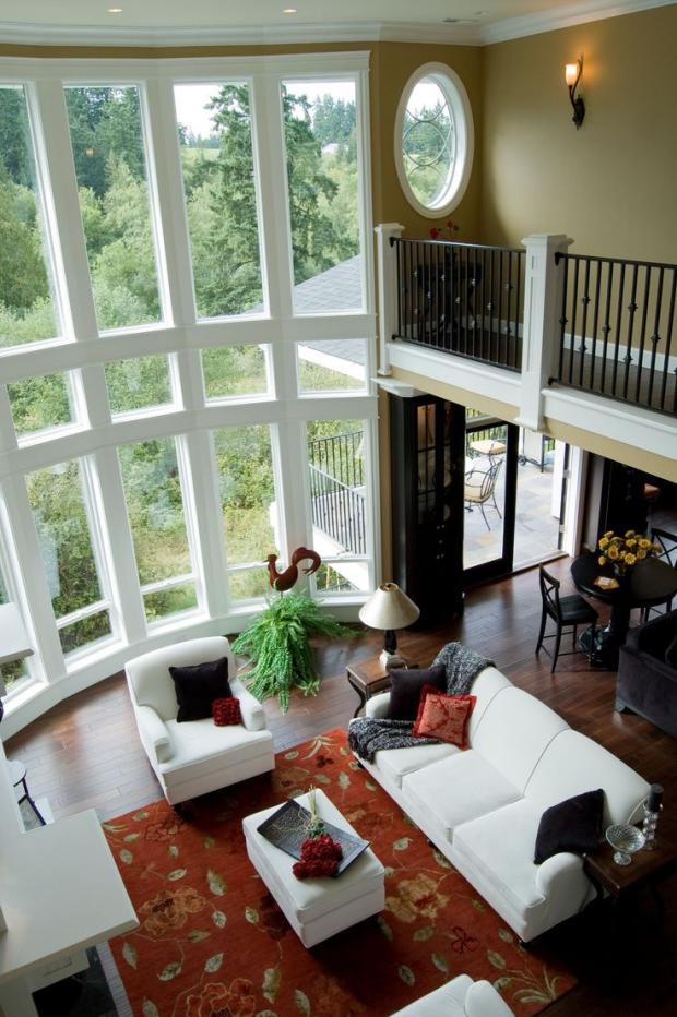 - Максимальное освещение. Двухуровневое расположение окошек многократно увеличивает естественную освещенность жилой комнаты. Даже если часть этого пространства будет отведена под антресоли, уровень естественной инсоляции в любом случае будет гораздо выше, нежели в типовой комнате. Это особенно гармонично в солнечных местах, поэтому двухсветные дома часто возводятся в регионах, где число солнечных дней в году мало. Правда, в таком случае придется заранее позаботиться о профессиональном утеплении оконных проемов. Иначе тепловые потери в жилом помещении будут велики.